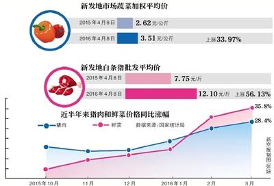 北京新發地市場統計室負責人劉通表示,從對北京市場90多個品類的蔬菜統計來看,今年3月加權平均價在3.68元/斤,去年同期維持在2.51元,上漲46%左右。