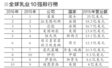 今年的榜單中,雀巢繼續位居第一,緊隨其後的是拉克塔利斯、達能、美國奶農、恆天然等。去年的榜單中,伊利位居第10,蒙牛第11;而在今年的榜單前10強中,伊利躍居第8,蒙牛繼續保持11位。值得注意的是,前10強中,僅有中國伊利銷售額是增長,其他全部下滑。