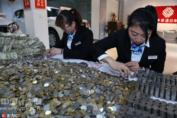“來的路上,硬幣太重,爆胎了。”購車者郭先生稱,“我們家開了個面粉店,不知不覺就存了這麼多零錢。”郭先生說,自己家里積攢了太多的硬幣,他曾找銀行兌換,但銀行覺得麻煩不願兌換,這次要買車,就打算拿來直接花掉。郭先生表示,由于銀行兌零錢的收取有一定條件,零錢換整十分不方便。幾年前,他曾拉著48萬的硬幣買了一輛奧迪。“希望相關部門能多提供一些‘化零為整’的服務。”