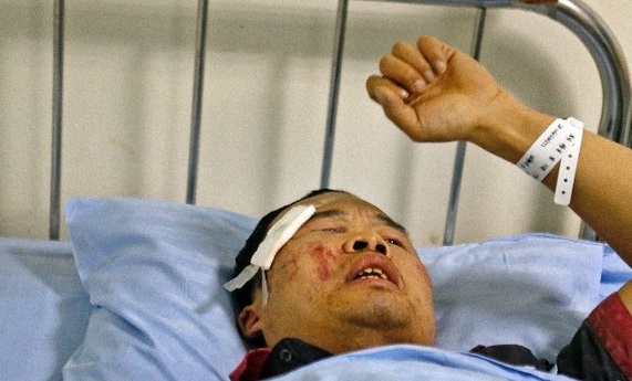 昨日下午3時30分許,長安醫院急診科病床上,老楊的兒子躺在床上,左手半握拳搭在額頭,右額頭上貼著紗布,右眼角周邊淤血痕跡明顯,面部也有多處淤血。病床上的診斷顯示:閉合性顱腦損傷,顏面部皮膚組織挫裂傷,鼻外傷。老楊說,兒子一直說腹腔部疼痛、頭疼,病情還需要進一步診斷。