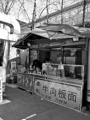 立湯路與太平莊中二街交叉路口的西北角,正是地鐵天通苑站。日前,北京晨報記者到達現場時,看到一個由報刊亭改裝的“小吃鋪”分外扎眼,只見亭子的鐵門完全敞開,門前擺著貼有“安徽牛肉板面”紅色大字的櫃臺。雖然報刊亭上方印有“中國郵政”的綠色標識、亭號及監督電話,但不見任何報紙雜志的影子(如圖)。