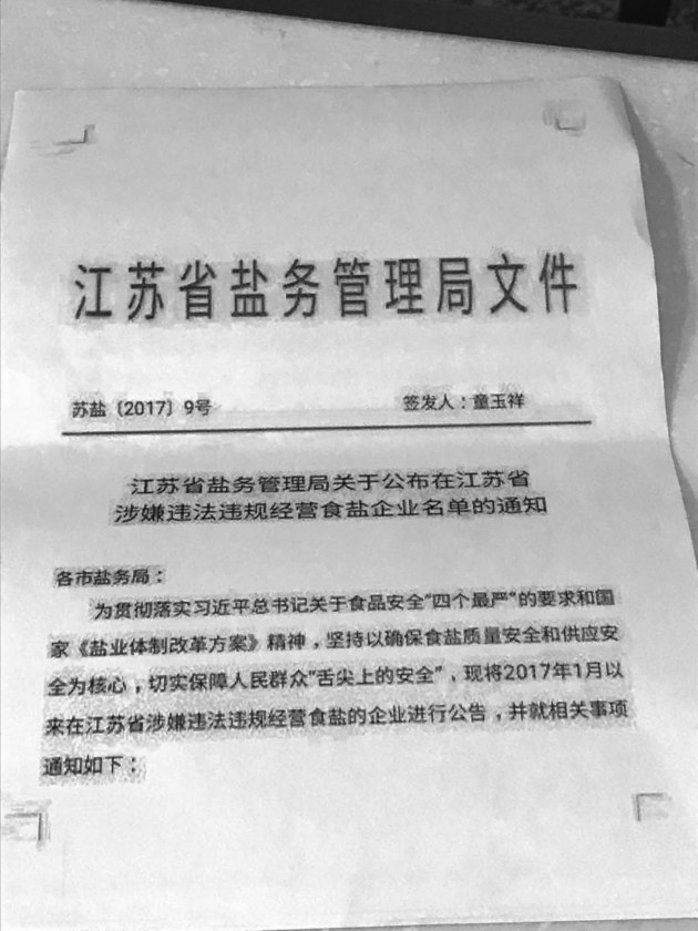 據此前中國食品安全網轉載報道,以及中鹽東興鹽化股份有限公司(以下簡稱中鹽東興)提供的一份復印件顯示,今年3月,江蘇省鹽務管理局(以下簡稱江蘇鹽務局)下發了一則《江蘇省鹽務管理局關于公布在江蘇省涉嫌違法違規經營食鹽企業名單的通知》(以下簡稱《通知》),上海市鹽業公司(以下簡稱中鹽上海)、中鹽東興等數家江蘇省外企業榜上有名。