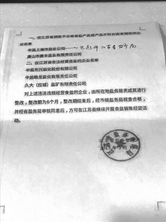 這份提供的《通知》中要求,對上述涉嫌違法違規經營食鹽的企業,由所在地鹽務局責成其進行整改,整改期為6個月,整改期結束後,經市級鹽務局核查合格,並經鹽務局審核同意後,方可在江蘇省繼續開展食鹽銷售經營活動。