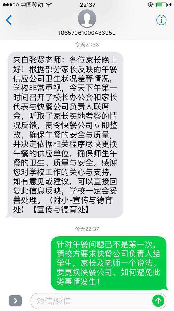 事發當晚,南京曉莊學校附屬小學也給各位學生家長發送了短信,進行安撫,以及通報整改信息。張賢對澎湃新聞表示,會第一時間把相關處理結果通報家長,聽取家長意見,盡可能滿足家長合理合法的要求。