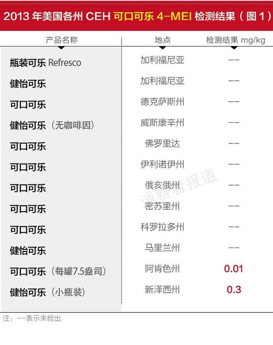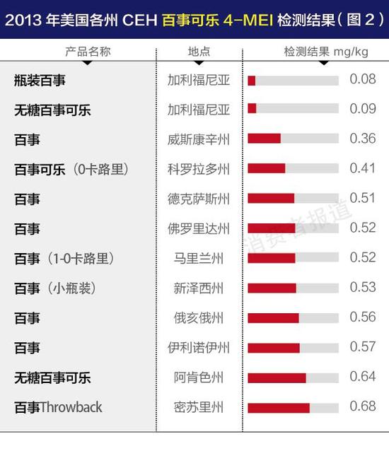 2012年,美國民間消費者權益組織公共利益科學中心(CSPI)發布全球可口可樂的測試結果,4-MEI的含量由4μg到267μg不等。而2013年,美國環境健康中心(CEH)也對美國國內多達11個州的可樂進行了測試,大部分百事可樂檢出的4-MEI含量要高于可口可樂。(如圖1、2)