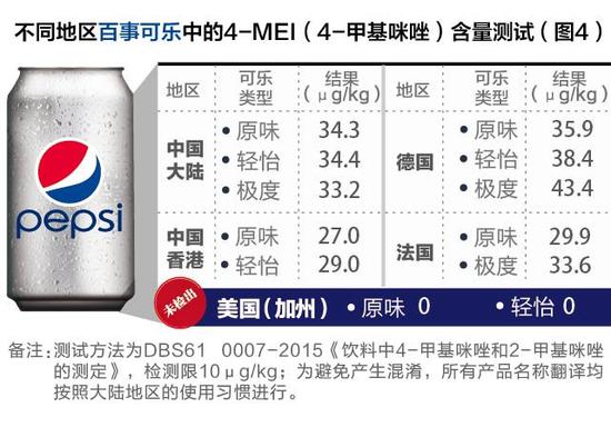 測試結果顯示,可口可樂在5個國家和地區已經檢測不到4-MEI;而百事可樂除美國加州地區未檢出之外,其它地區均有不同程度的檢出。
