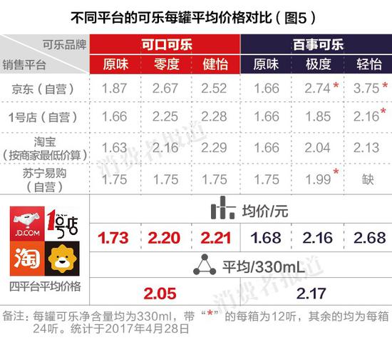 以常見的330mL易拉罐可樂為例,《消費者報道》搜集了京東、1號店、淘寶及蘇寧易購等4個主流網購平臺的數據,然後計算出各款可樂在這4個平臺的平均價格,發現可口可樂的原味比百事可樂的原味貴0.05元;但百事可樂的輕怡卻是6種可樂中價格最高的,比可口可樂的健怡貴0.47元。(如圖5)