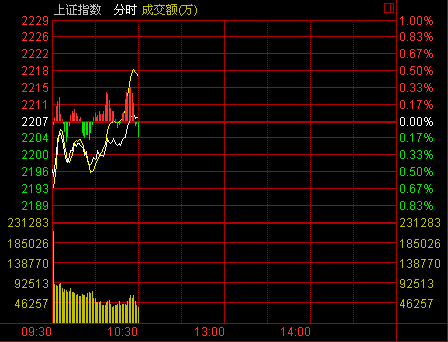 新華網消息 3日滬深兩市小幅低開,早盤股指圍繞2200點附近震蕩,創業板一度跌逾4%。金融股今日歇腳,煤炭、船舶、釀酒等板塊先後發力上攻,滬指翻紅收復2200點,創業板跌幅收窄。截至上午10點30分,滬指報2207.42點,漲幅0.00%;深成指報8410.79點,漲幅0.41%;創業板指報1230.49點,跌幅1.87%。
