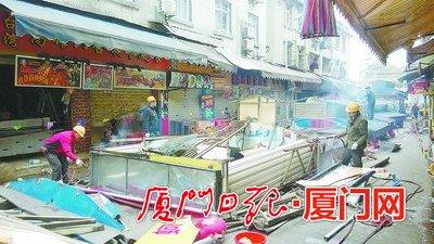 昨日,記者在現場看見,原本臺灣小吃街48個攤位所在的鐵皮屋,已經幾乎被“夷為平地”,只剩下人和路靠輪渡方向還有幾座鐵皮屋仍在拆除當中,拆除後的部分剩余鐵皮還未被搬走。