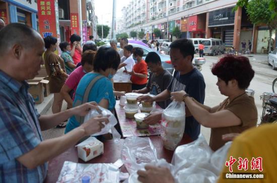 9月19日,泉州市洪瀨鎮民眾正在發放免費的食物。被稱為今年全球最強臺風的“莫蘭蒂”9月15日在福建廈門登陸後攜風裹雨肆虐閩南地區,也給泉州造成了巨大災害。截至9月18日16時,臺風“莫蘭蒂”已造成泉州13人因災死亡,4人失蹤仍在搜尋中;因災直接經濟總損失已達68.81億元人民幣。中新社記者 呂明 攝