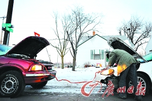 24日,美國南達科他州,一名男子借助別人的車啟動自己的車。