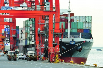 日本10日公布的數據顯示,受巨額貿易逆差拖累,2013年日本國際收支經常項目順差額創歷史新低,為3.3061萬億日元,比前一年減少31.5%。數據還顯示,經季節調整後,2013年12月日本國際收支經常項目出現1967億日元逆差額,為連續4個月出現逆差。圖為10日在日本東京的一個貨運碼頭,貨輪正在裝載貨物。 (新華/法新)