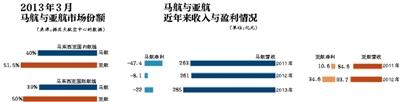 據亞太航空中心的數據,2013年3月,馬來西亞國內航線的客運市場上,馬航的份額為40%,而亞航佔到了51.5%。在國際航班方面,馬來西亞的國際航班市場中,亞洲航空的市場份額為50%,馬航為39%,處于全面劣勢。