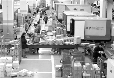 大韓通運的一處中轉站正在進行貨物分揀。 本報駐首爾記者 楊 明攝