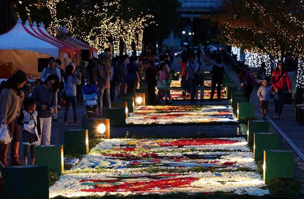 據日本《產經新聞》11月3日報道,日本第14屆晴海鮮花節于2日在東京開幕,由6.5萬朵玫瑰花的花瓣和彩色細沙制成的“花毯”繪出了絕美夜景。