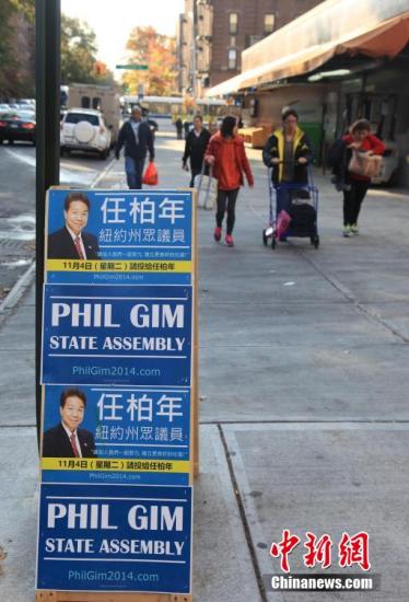 11月4日,美國中期選舉如期舉行,其中最受關注的是國會中期選舉。美國眾議院435個議席將全部改選,同時,參議院中的36個席位以及36個州的州長都將重新選舉。此次中期選舉中,“參議院之爭”備受矚目,如果共和黨贏得6個參議院席位,即可掌控國會,並將使美國的政治風向發生重大轉變,總統奧巴馬施政方案或遭掣肘。圖為紐約皇後區亞裔社區內,一位華裔候選人競選紐約州眾議員的宣傳牌。 中新社發 阮煜琳 攝
