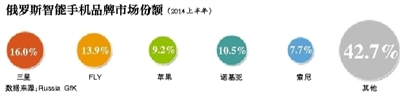 調查顯示,同很多國家一樣,三星在俄羅斯的銷量佔據榜首的位置;排名第二的Fly,其市場份額達13.9%;列三到五位分別是諾基亞、蘋果和索尼,三者之間佔比差距並不大。而YotaPhone品牌已經歸入到“其他”一類中。