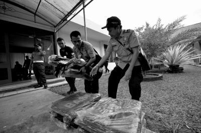 12月30日,在印度尼西亞邦加檳榔機場,搜救隊成員整理屍體袋。新華社發