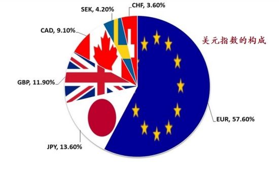 美元的強弱反映在一個指標上,那就是美元指數。美元指數是紐約棉花交易所(NYCE)編制于1973年的美元指數。美元指數最初參考1973年3月10種貨幣對美元匯率變化的幾何加權平均值來計算,1999年歐元誕生後,原來歐洲5種貨幣合並為歐元,五者相加的權重佔比57.6%,正是後來歐元所佔的權重,另外還有5種貨幣的權重沒有改變,分別是:日元13.6%,英鎊11.9%,加元9.1%,瑞典克朗佔4.2%,瑞士法郎3.6%。