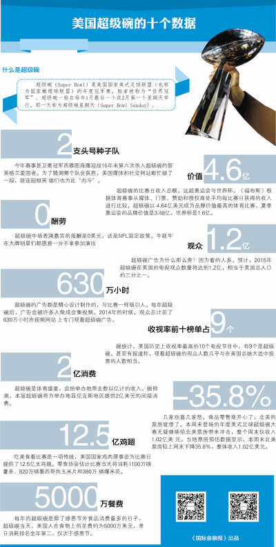 “超級碗”是美國國家美式足球聯盟(NFL)的年度冠軍賽,一般在每年1月最後一個或2月第一個星期天舉行,參賽球隊為該賽季美國美式足球聯會冠軍和國家美式足球聯會冠軍。2015年“超級碗”由新英格蘭愛國者隊和西雅圖海鷹隊捉對廝殺。
