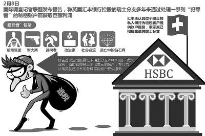 國際調研記者協會近日披露,在2005年到2007年間,匯豐銀行瑞士分行協助10萬名重量級客戶避稅及隱藏高達千億美元資產。列在這些檔案中的有來自英國、俄羅斯、印度和一些非洲國家的前任或現任官員,有沙特、巴林、約旦和摩洛哥王室成員,還有澳大利亞傳媒大亨。25日,英國議會財政委員會已就此事質詢匯豐高管,匯豐高管已承認其瑞士分行存在過錯。