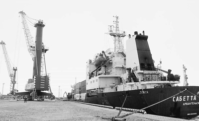 經由北極航線運抵亞馬爾的施工模塊在薩別塔港進行卸裝。