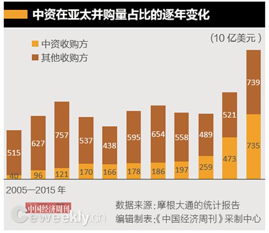 摩根大通報告顯示,亞太地區2015年的並購總量為1.5萬億美元,其中中國企業發起的並購交易量為7350億美元,較2013年增長近兩倍;兩年時間里,中國在整個亞太地區並購交易量中的佔比從35%增長到50%。