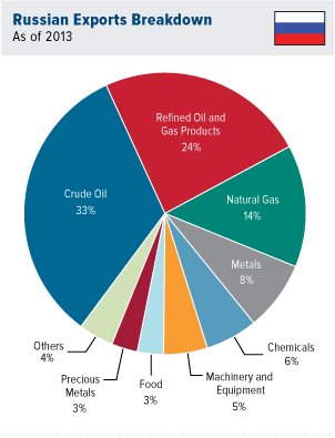 下圖為2013年俄羅斯出口商品分解圖。從圖中不難看出,原油出口額佔了俄羅斯總出口額的33%,精煉油和石油產品佔了24%,而天然氣則佔了14%,這三項的總佔比為71%。