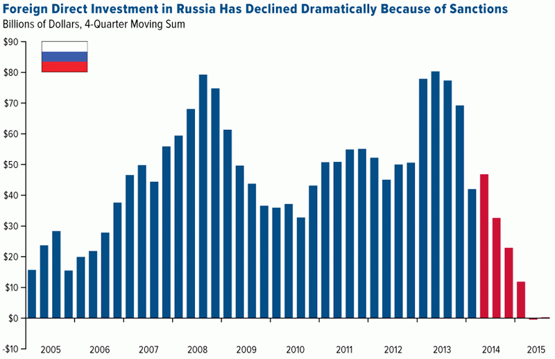 下圖表明由于制裁措施俄羅斯獲得的外國直接投資已經大幅減少。