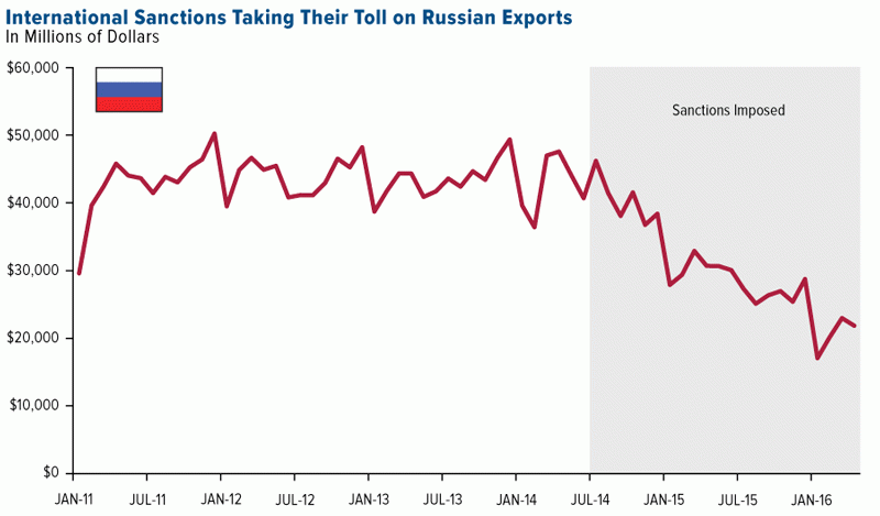 但是制裁措施也造成了非常顯著的影響。根據國際貨幣基金組織的數據,貿易限制措施是俄羅斯2015年國內生產總值減少1.5%的原因,制裁措施持續時間越長,其影響將越大。