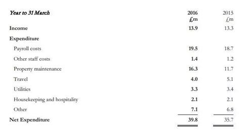 比如在王室公布的2015-2016年度財報中,2015年的收益為1330萬英鎊,凈支出3570萬英鎊;2016年的預算則為,收益1390萬英鎊,凈支出增加到了3980萬英鎊。