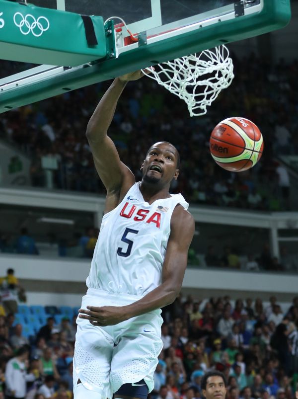 資料圖片:2016年8月8日,美國隊球員杜蘭特在比賽中扣籃。 新華社記者孟永民攝