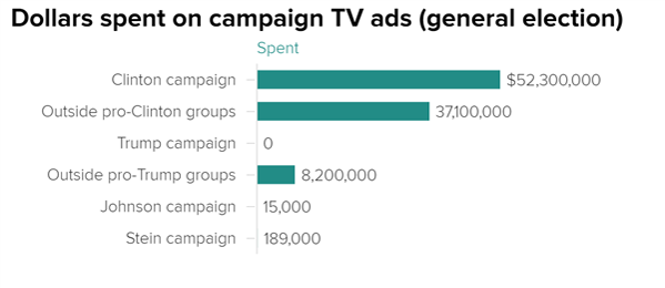 報道稱,另有雙方陣營的外部支持團體為兩名候選人打廣告。希拉里的支持者為希拉里在各類電視廣告上花的總金額也高達3710萬美元,而特朗普的支持者在廣告上的耗費為820萬美元。