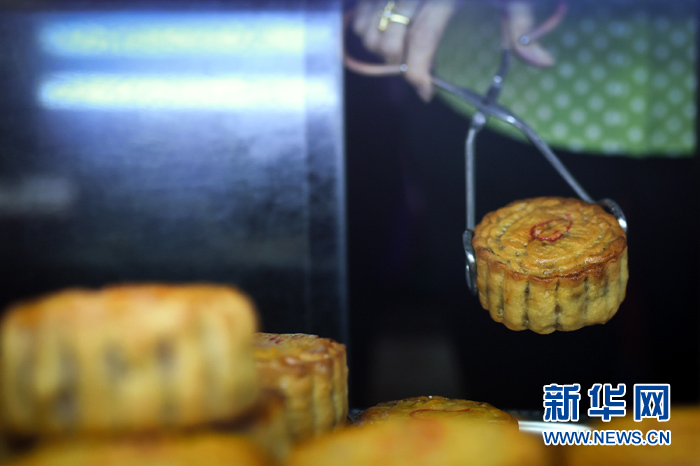 在泰國曼谷唐人街一家糕餅店,工作人員夾起一塊月餅。新華社記者 李芒茫 攝