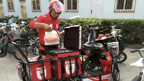 他每天跑遍北京西北的科技園區,穿著紅色制服,騎著“都市風”電動自行車,何志剛在互聯網初創公司和鱗次櫛比的公寓大樓之間穿梭。在餐廳和辦公室、飯店和居民區之間,他每天大約服務30個客戶。他知道哪家商店散發著醋味兒,哪棟公寓樓有“汪汪”大叫的狗。