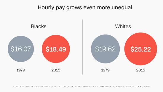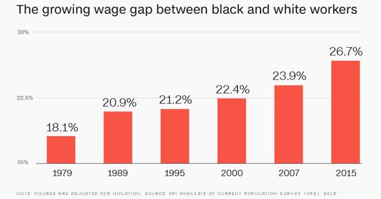 去年,黑人和白人之間的時薪差距擴大到了26.7%,白人平均25.22美元,黑人18.49美元。近四十年前的1979年,這個差距為18.1%,以今日美元計算,白人為19.62美元,而黑人為16.07美元。