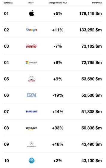 中國日報網10月11日綜合(徐子茗) 全球最大的綜合性品牌咨詢公司Interbrand日前發布了《2016年全球最佳品牌》報告。不出意外,蘋果再次成為了全球最有價值的品牌。谷歌和可口可樂緊隨其後。微軟、豐田、IBM、三星、亞馬遜、梅賽德斯奔馳以及通用電氣也躋身前10名。值得注意的是,此次榜單中,中國品牌華為和聯想入圍,分列第72和99位。