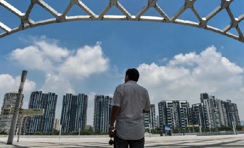 資料圖片:一名男士站在深圳市南山區的住宅前 新華社記者毛思倩攝