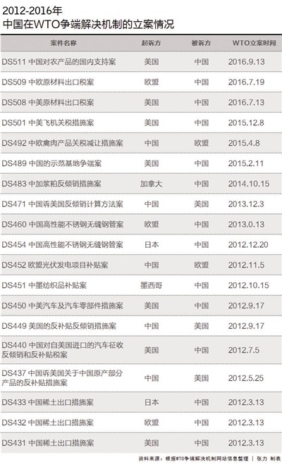 入世以來中國一直是保護主義打擊的首要對象國。截至2016年10月,中國在WTO爭端解決機制下共提起爭端案件13起,被訴37起,提起和被訴爭端案件共計50起。受2012年全球復雜經濟形勢的影響,中國在該年提起和被訴的爭端案件均達到峰值,分別為3起和7起。