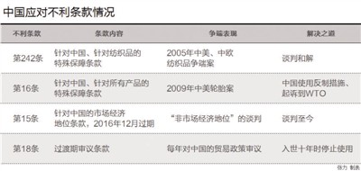 入世15年來,除WTO爭端解決機制內的保護外,中國還要應對一些專門針對中國的貿易歧視。2001年中國加入WTO時簽訂了《中華人民共和國加入議定書》以及《中國加入工作組報告書》等多份法律文件,承諾中國除了需要遵守所有WTO成員均需遵守的多邊貿易協定義務以外,還需要遵守諸多單獨針對中國實行的“超WTO義務”,這些條款通常被視為入世協議中的不利條款。15年來,這些不利條款成為中國應對貿易保護主義的主要防禦對象。