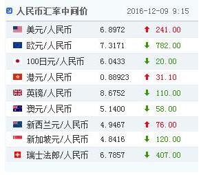 中國人民銀行授權中國外匯交易中心公布,2016年12月9日銀行間外匯市場人民幣匯率中間價為:1美元對人民幣6.8972元,1歐元對人民幣7.3171元,100日元對人民幣6.0433元,1港元對人民幣0.88923元,1英鎊對人民幣8.6752元,1澳大利亞元對人民幣5.1400元,1新西蘭元對人民幣4.9467元,1新加坡元對人民幣4.8416元,1瑞士法郎對人民幣6.7857元,1加拿大元對人民幣5.2263元,人民幣1元對0.63916林吉特,人民幣1元對9.1767俄羅斯盧布,人民幣1元對1.9800南非蘭特,人民幣1元對168.65韓元,人民幣1元對0.53239迪拉姆,人民幣1元對0.54367里亞爾。