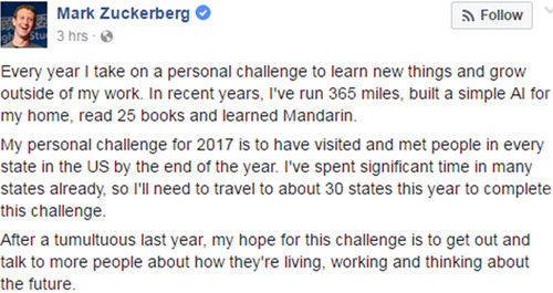 今年也不例外,扎克伯格表示,“2017年,我的個人挑戰是拜訪美國每一個州,與那里的人會面交流。我已經在許多州呆過很長時間。所以,我今年需要走訪大約30個州,完成這個挑戰。”