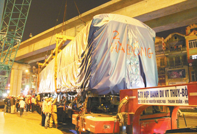 吉靈—河東線城鐵共採購13列電動客車,每列車分別有4輛車廂。按照施工進度要求,首列車的4輛車廂于1月20日從北京地鐵車輛裝備有限公司出廠,2月12日運抵越南北部的海防港,19日淩晨到達河內。21日淩晨,在上百名越南圍觀群眾的歡呼和掌聲中,中國專為越南首條城鐵定制的第一輛列車車廂被成功吊裝上橋。盡管下著細雨,幾十名記者用長槍短炮對準即將起吊的車廂拍攝,空中還飛著幾架拍攝用無人機。