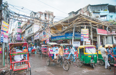 在印度許多地方的大街小巷,纏繞如蛛網的低垂電線隨處可見,私拉電線偷電現象嚴重。圖為印度德里老城區,交錯的電線電纜懸挂在街道上方。