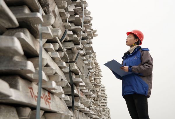 工作人員在鋁錠倉庫進行登記檢查工作。新華社發