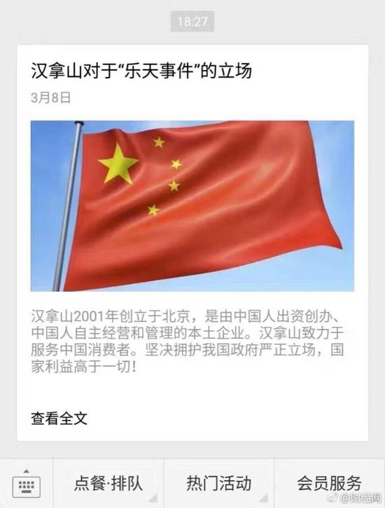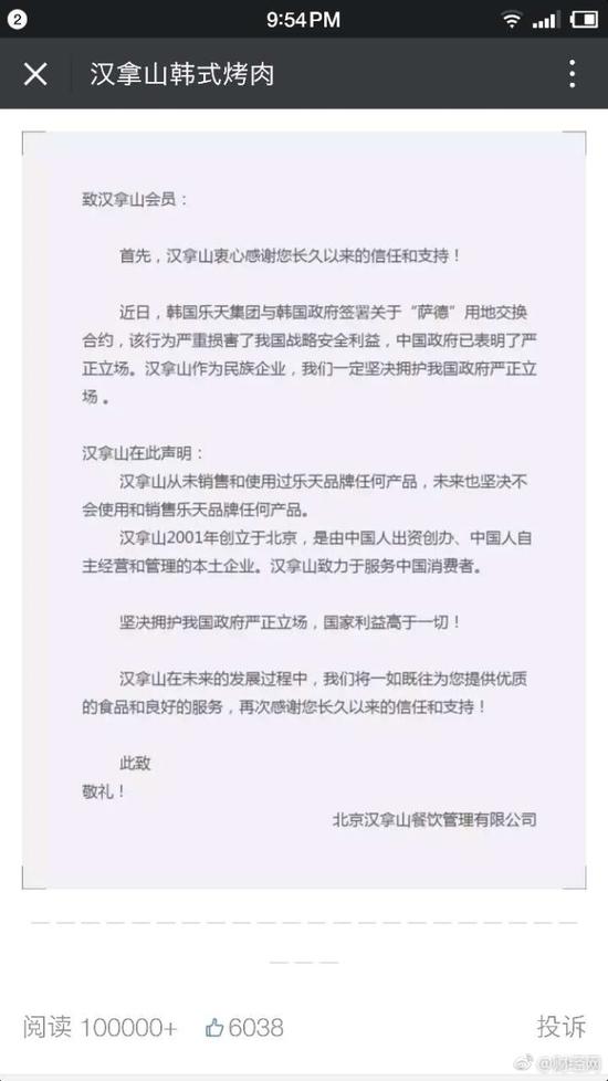 以號稱引領國內韓餐時尚,經營韓式烤肉、韓式拌飯等韓餐係列知名,在北京等地開有多家連鎖店的餐飲企業漢拿山發澄清聲明:我們是百分百中資企業。未使用和銷售過樂天的產品,未來也堅決不會使用。(說明:漢拿山是韓國三大名山之一)