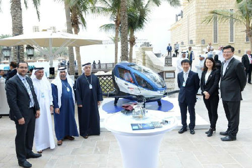 2月13日,在阿拉伯聯合酋長國迪拜,迪拜交通局局長馬塔·塔伊爾(前排左四)與中國億航公司團隊在“億航184”載客無人機前合影。(新華社)