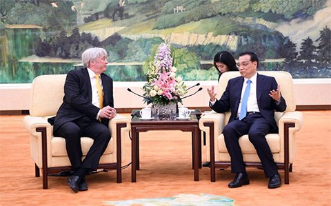 李克強總理會見世界技能組織主席和CEO兩位外賓。中新社 毛建軍 攝