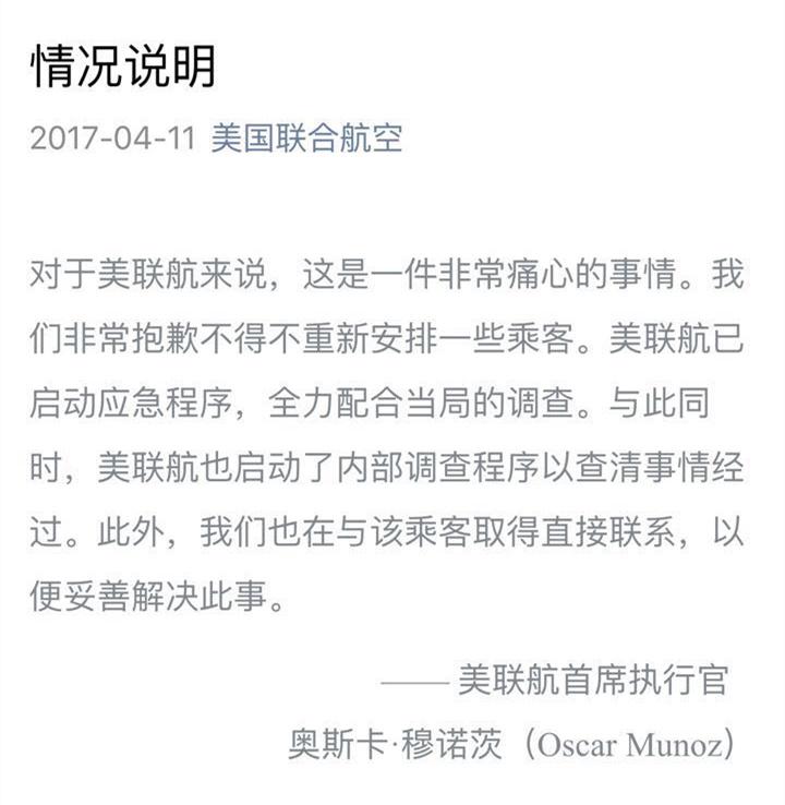 對于美聯航來說,這是一件非常痛心的事情。我們非常抱歉不得不重新安排一些乘客。美聯航已啟動應急程序,全力配合當局的調查。與此同時,美聯航也啟動了內部調查程序以查清事情經過。此外,我們也在與該乘客取得直接聯係,以便妥善解決此事。