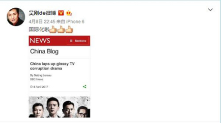 海外網4月10日電 4月8日,反腐題材電視連續劇《人民的名義》中李達康書記的扮演者吳剛在其微博上表示:“越來越國際化了。”並連發三個點讚手勢,配圖正是BBC對該劇的新聞報道截圖。